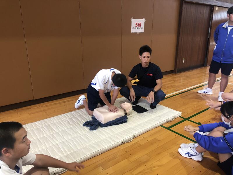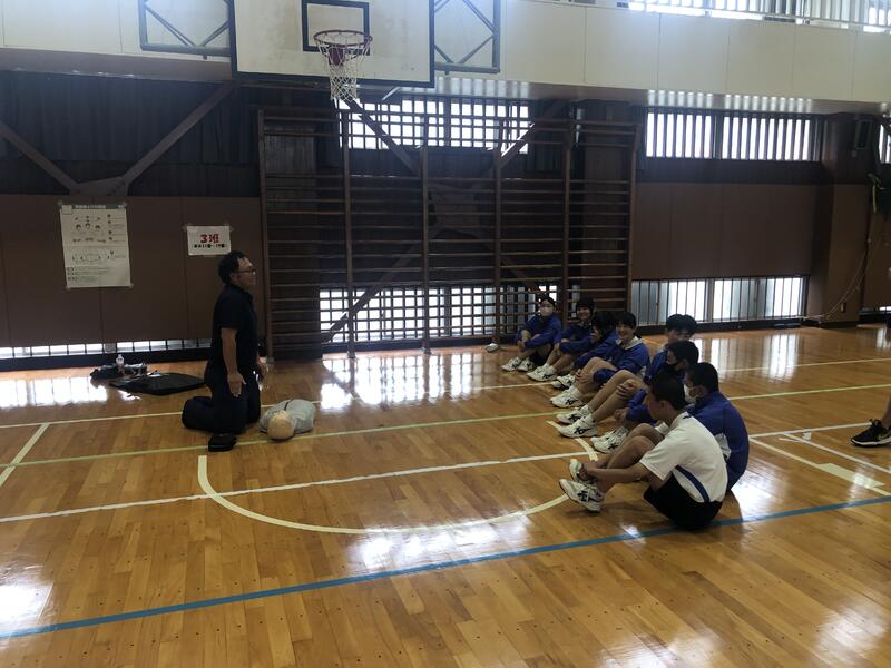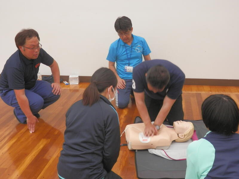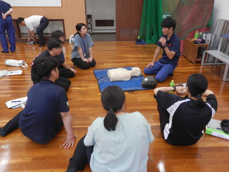 5月28日(水)の校内研修で、教職員も下球磨消防署の方々から、命を守るための研修を受けました。