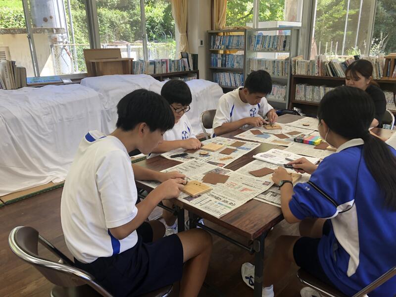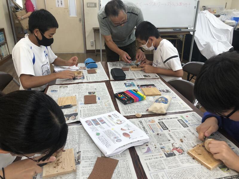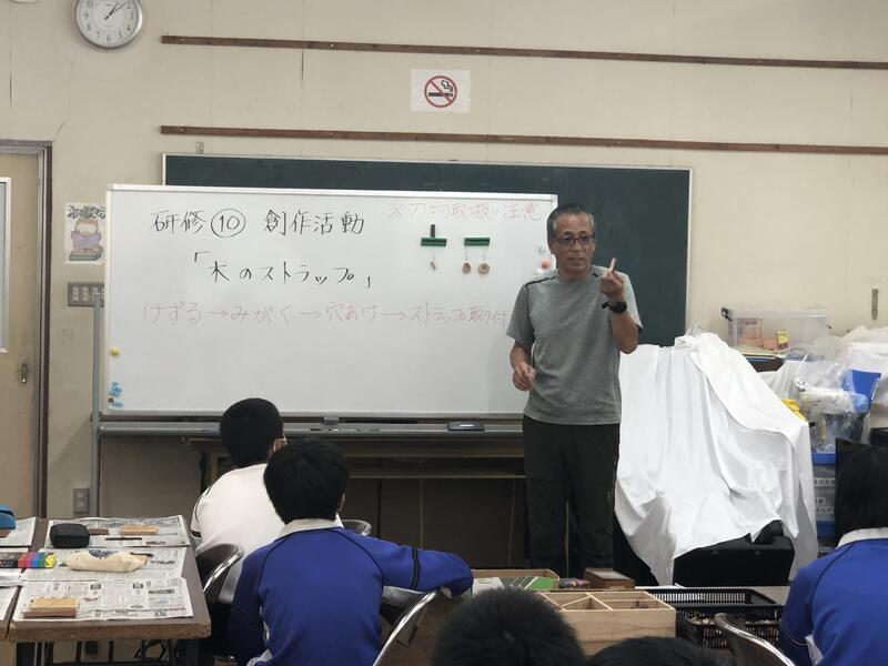 創作活動で木のストラップを作ります。