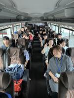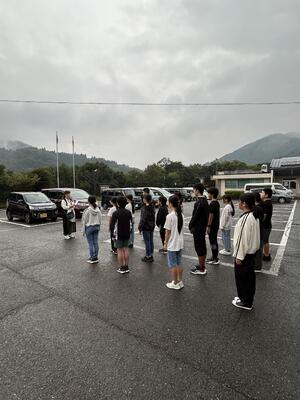 小雨の中、役場駐車場で出発式を終え、6年生全員が無事長崎に向けて出発しました。
