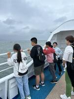 美ら海水族館でイルカショーを観覧し、大きなジンベエザメを前に生徒たちは感激の声を上げていました。今から名護市のホテルに向かいます。