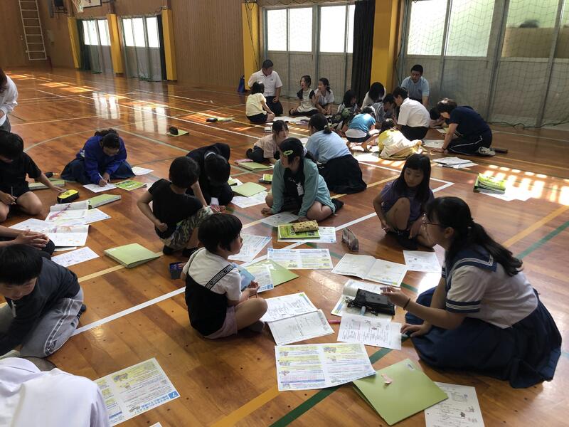 スクールバスの路線ごと(徒歩通学も数班に分かれて)に1年から9年までの縦割り班を編成し、改めて顔合わせをしました。