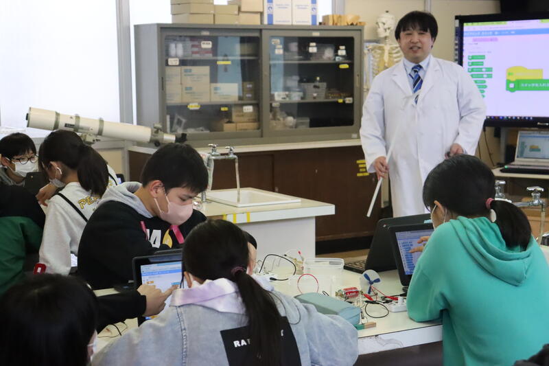 授業では、前半の活動においてプログラミングについて詳しく説明いただき、後半の活動では、タブレットPCを用いてプログラミングを体験。子どもたちは、センサーで光る電球や熱感知で動く扇風機作りに熱心に取り組んでいました。