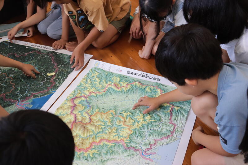 授業では、復興局の方々が、緑の流域治水について動画や立体地図などを使って子供たちに分かりやすく説明してくださいました。