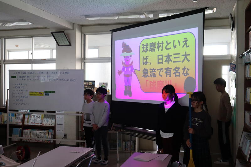 5年生社会科の授業(乗り入れ)を担当する球磨中学校の白石先生が学習を進め、子供たちが地域の特色をプレゼンにまとめ、上士幌小学校の5年生に発表しました。