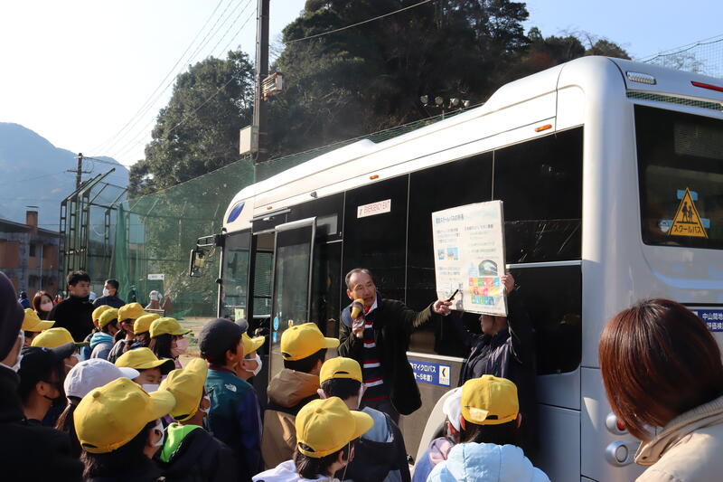 現在、出発式を行い、スクールバスで研修①の現地視察に来ています。