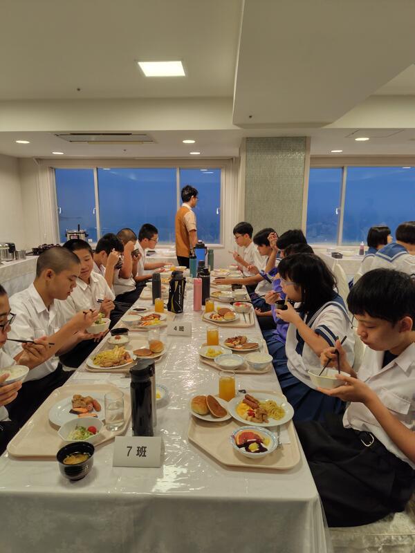 美ら海水族館でイルカショーを観覧し、大きなジンベエザメを前に生徒たちは感激の声を上げていました。今から名護市のホテルに向かいます。