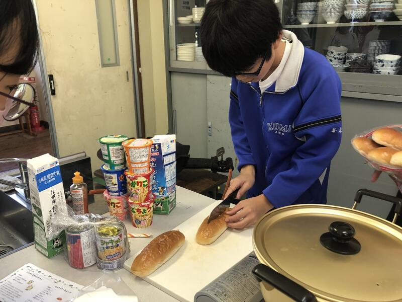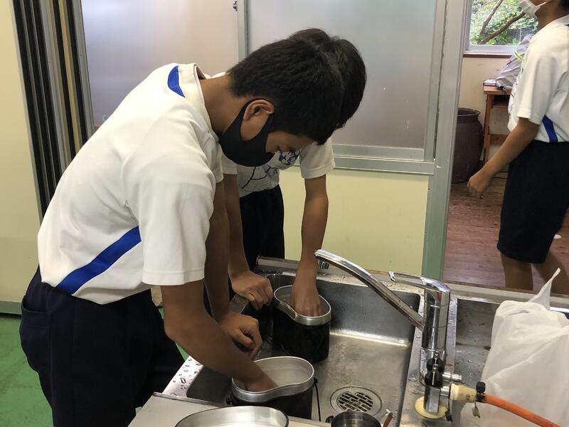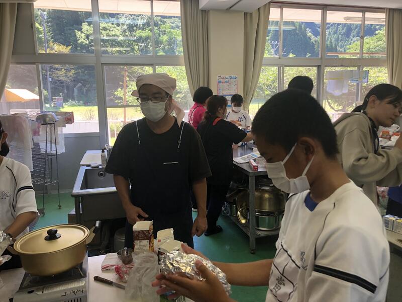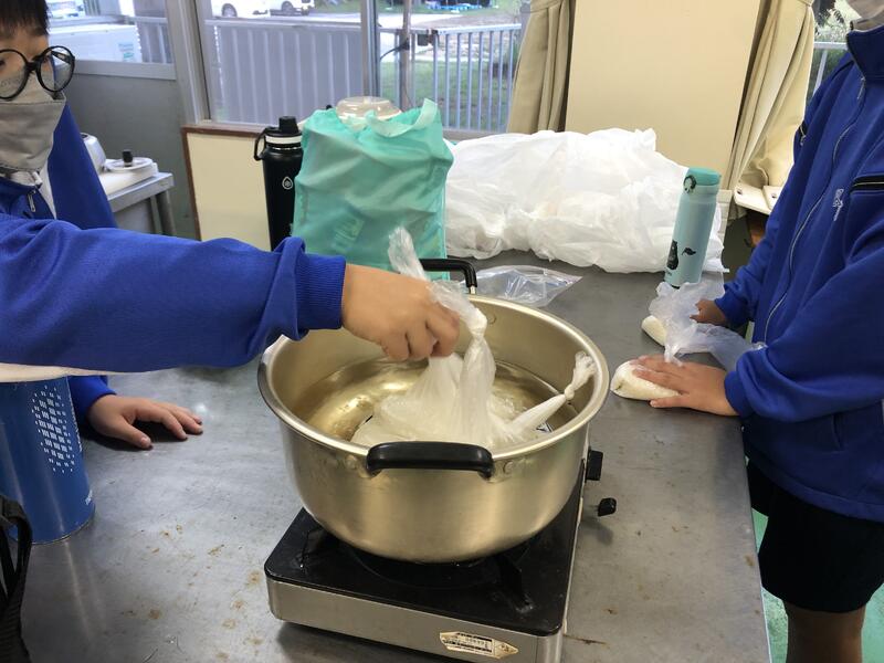 朝食作りです。お米をポリ袋調理の方法で準備しています。