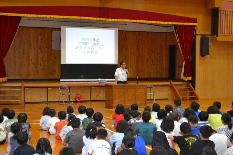 8月28日(水)に北体育館におきまして、2学期始業式を行いました。式の前に、ソフトボール部の熊本県中学校総合体育大会3位の表彰をしました。暑い中とても良く頑張りました。始業式においては、3年生、6年生、8年生代表児童生徒の3名が夏休みの思い出と2学期に頑張りたいことを堂々と発表しました。また、荒牧副校長先生から、「2学期はとても長くたくさんの学校行事があります、『3つのわ』」を大事に多くのことに『挑戦』してください」とお話がありました。