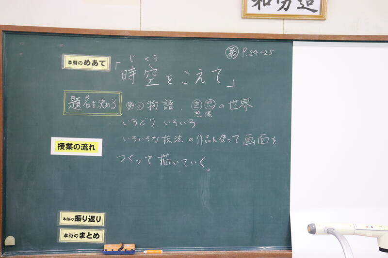「時空をこえて」という単元で、スパッタリングやフロッタージュ、デカルコマニーといった表現技法をいかした作品づくりにチャレンジしていました。