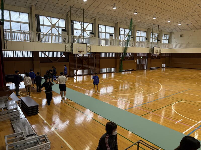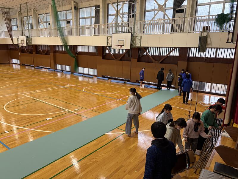 南体育館では、式典会場設営担当の6・7年生が協力して準備を進めていました。
