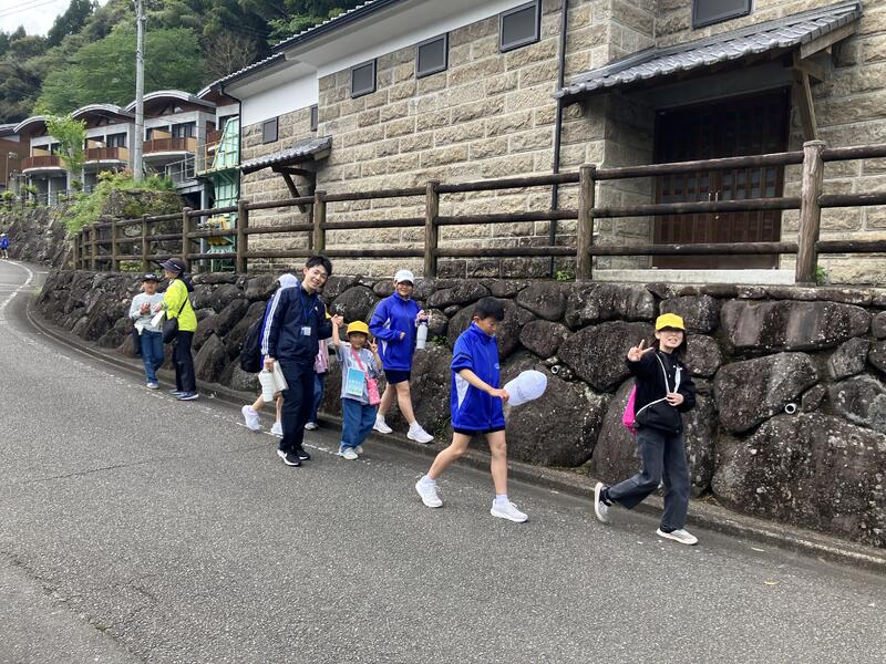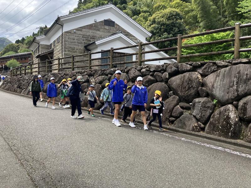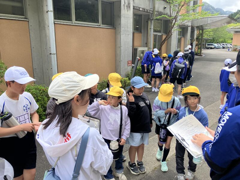 縦割り班でクイズに答えながらみんなで春の球磨村を満喫しています。