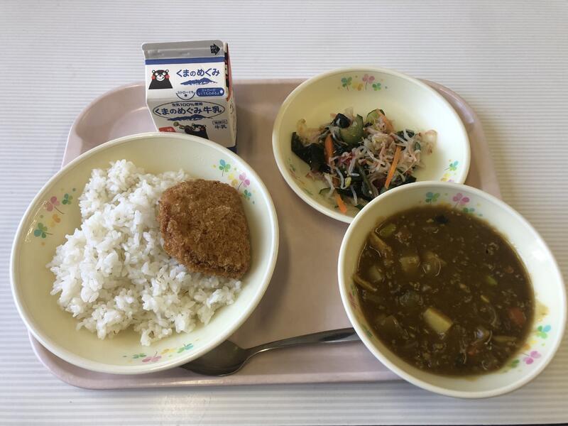 今日の給食は、受験応援メニューと題し、カツカレーでした。
