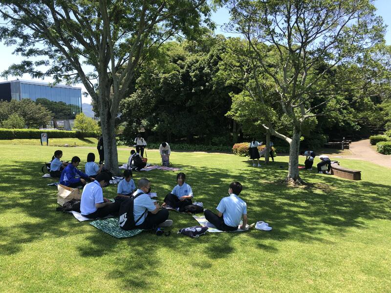 水俣病資料館で語り部さんのお話を聞き、全体の前で発表を行いました。昼食を木陰で食べています。