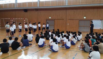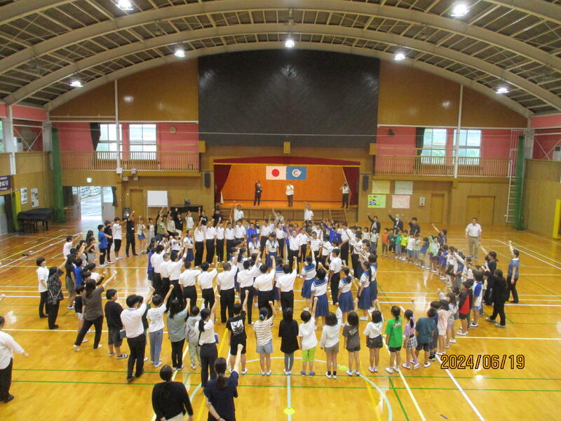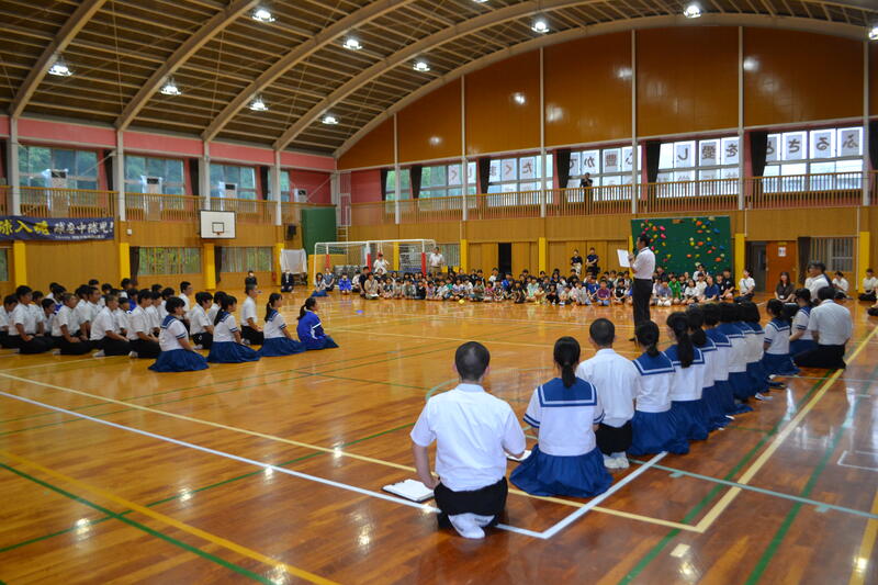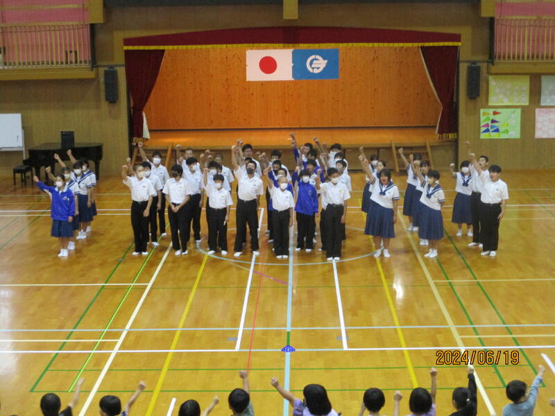 6月20日(木)朝の活動時間を使い、北体育館において全児童生徒が参加し、大会に出場する7年生から9年生を激励しました。式の運営は、7年生から9年生に実行委員会を募り、自分たちで計画・運営しました。また、1年生から6年生も応援メッセージを書いてくれたり、全児童で「フレー フレー 球磨清流学園」とエールを送ってくれました。いつもにない推戴式でやる気に満ち溢れていました。天気が心配ですが、全力で戦ってきます。
