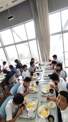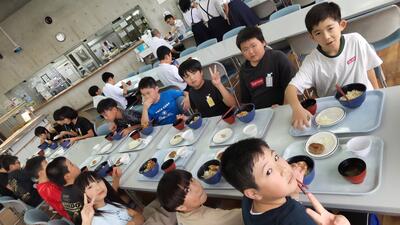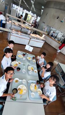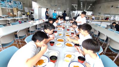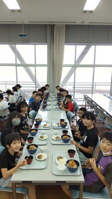 朝の集いを終えて朝食中です。今日もあいにくの天候のため雨天プログラムとなりそうです。