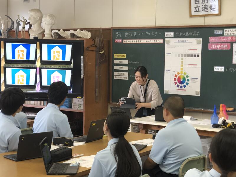 防災をテーマに授業が実施されましたが、誰もがはっきりと見て認識できる避難所の標識の配色を考えることをミッションとして活動がなされました。