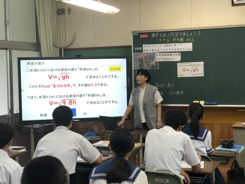 問題に取り扱ったのは、津波の速さ、到達時間。どのような数学の考えを使うと、それを予想することができるのか、個人やグループで考え、答えを導き出していました。