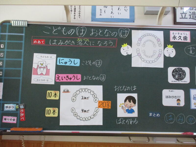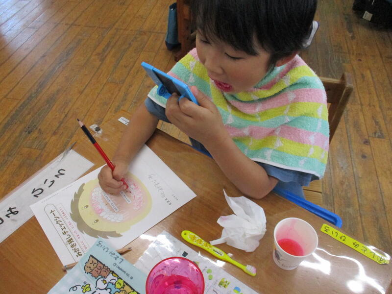6月4日(水)に吉田養護教諭の指導の下、歯みがき指導が行われました。歯の大切さについて説明が行われた後、正しい歯みがき方法が示されました。実際に歯ブラシを正しく操作できているか、歯に薬を塗って、確認をしました。児童は、歯ブラシの操作の難しさに悪戦苦闘していました。