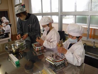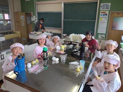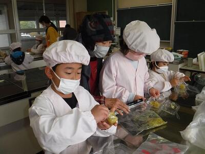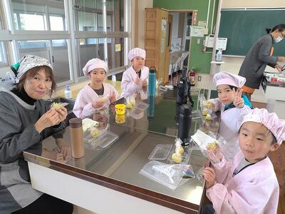地域学校協働活動の一環として、ゲストに来ていただき1・2年生は収穫したイモを使ったお菓子作りを体験しました。