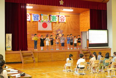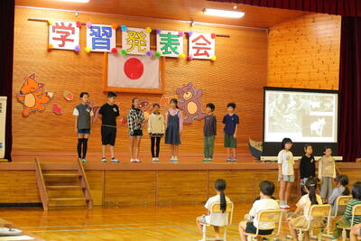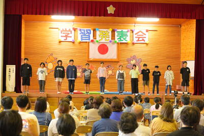 5・6年生。5年生は環境学習、6年生は平和についての学習を中心に発表しました。