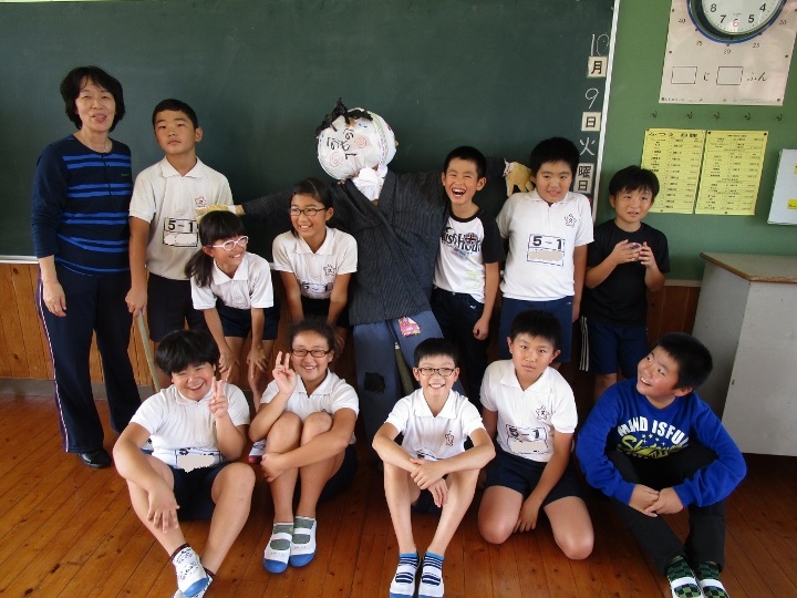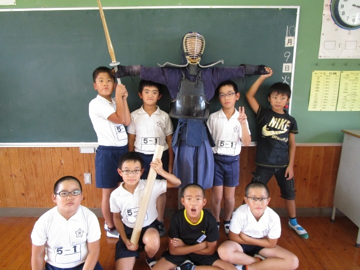 1029()の5・6校時に、学童農業体験「稲刈り」に行きました。6月に植えた苗が立派に生長し、よく稲穂が実っていました。今年から稲刈り前にコンバイン乗車体験もあり、5年生からも2人の児童が代表して乗車体験を行いました。幼稚園の頃に、鎌で稲を刈る体験をしている児童が多く、慣れた手つきで稲を刈っていました。稲刈りの後は、おにぎりと豚汁が振る舞われ、おいしくいただきました。また、閉会式では、かかしコンクールの結果発表が行われ、2体作ったうちの1体が「特別賞」に入り、景品として「きゅうり」をいただいて帰ってきました。みんなで刈った稲は、精米していただいた後、12月の学年行事で餅つきをして、食べる予定です。