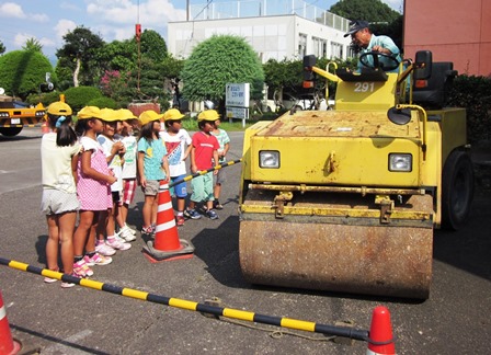 護者の方のご厚意で、クレーン車、ローラー車、バックホー、