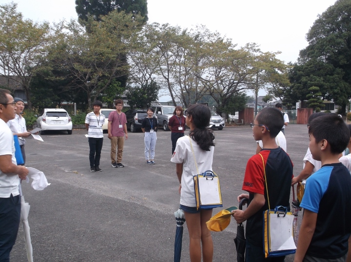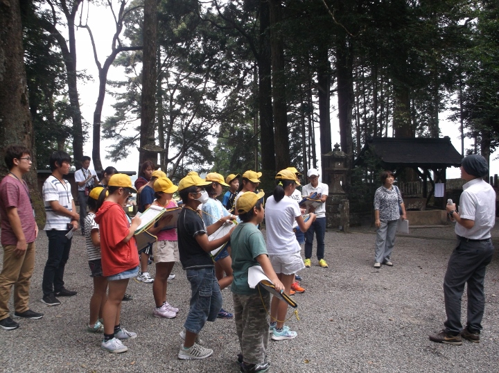 9月4日(月)6年生は、久米地域の学習のためフィールドワークに出かけました。多良木町教育委員会から2人、そして、沖縄県の琉球大学から4人の大学生の方にも来ていただき、一緒に中山観音堂や熊野座神社に行き、久米の歴史について学習しました。