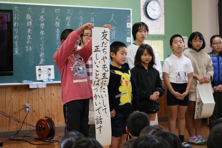 12月14日(木)にかがやきスクール人権集会が、人権委員が中心となって行われました。校長先生のお話、人権委員は熊本県人権子ども集会を聞いた感想、1~3年生の人権宣言を発表しました。