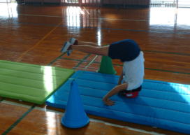 5年生の体育では、鉄棒の学習が始まり、前方支持回転や後方支持回転等の回転技に挑戦しています。これらの回転技に上がり技や降り技を組み合わせて、発表する予定です。また、雨の日にはマット運動に取り組んでいます。新たな技として、跳び前転、伸脚後転、ロンダート、倒立前転に挑戦します。難しい技にも意欲的に挑戦しようとする子どもたちの成長が楽しみです。