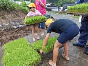 6月24日(火)に田植えをしました。雨が降っていたのですが、田植えの時は雨がやみ、充実した活動ができました。保護者の方に手伝ってもらいながら、子ども達はどろんこになって頑張りました。田植え機も一人ずつ運転させていただきました。ありがとうございました!