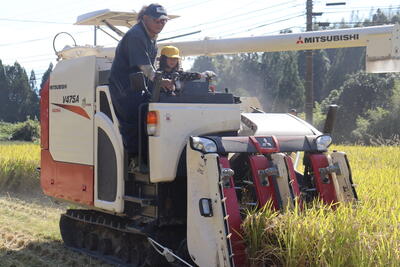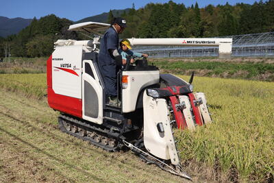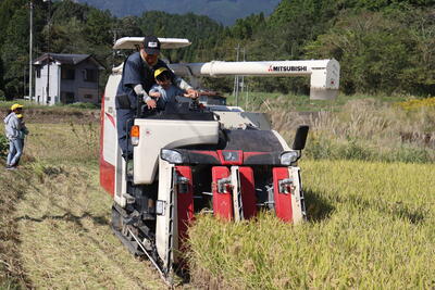 順番に子どもたちがコンバインに乗って稲を刈ります!
