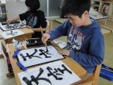 集中して1画1画丁寧に書いていました。力強く、しっかりとした筆使いをほめられ、うれしそうな2人でした。