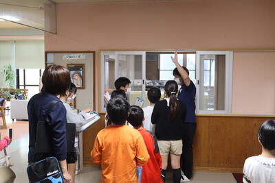 最初に、校舎内を分校1年生児童が本校1年生を案内しました。