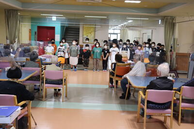 今日(10月10日)本校の4年生と一緒に総合的な学習の時間で、町内にある特別養護老人ホームへ学習に行ってきました。