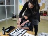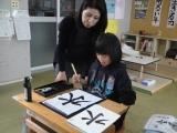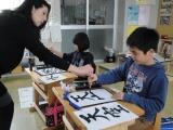 集中して1画1画丁寧に書いていました。力強く、しっかりとした筆使いをほめられ、うれしそうな2人でした。