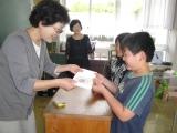 子どもたちは「a bread please」や「a pizza please」と上手に答えていました。