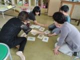 次に、カードを並べかるた取りの要領で、英語で言われた食べ物のカードを取ったりとゲームを楽しみました。