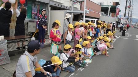 歩いて祭り会場まで行き、お弁当とおやつを食べた後、御輿パレードを見学しました。