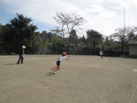 キックベースならぬ、三角ベース・・・人数が少ない分校ならではの工夫です。人数が少ないので自分の番になるのもあっという間です。