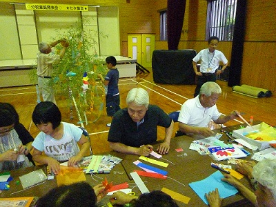 老人会の皆さんと一緒に七夕飾りを作りました。大きな竹にきれいな飾りがどんどんついていって、それぞれの願いをかいた短冊も天に届くよう、しっかりと結んで。。。。
