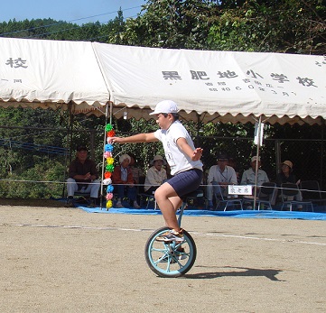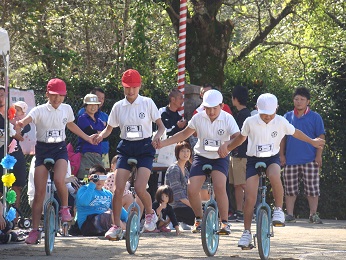 伝統競技「一輪車」は分校出身の本校5・6年生も一緒に出ます。