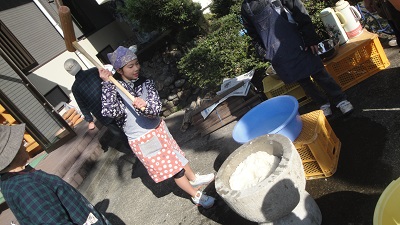 石臼と杵で餅をつくのは初めてという児童も多い中、経験豊富な老人会のおじいちゃん、
