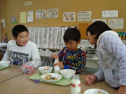 【給食の様子】 牛乳のフタ、ちゃんと開けれるかな~?