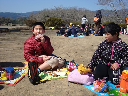 6年生を送る「お別れ遠足」がありました。当日朝は久しぶりに冷え込みましたが、どんどん気温も上がり、目的地の八日原運動公園に到着する頃には、暑いくらいの絶好の遠足日和でした。お楽しみのお弁当は地区毎に集まって食べました。青空の下で食べるお弁当は、とっても美味しかったようです。