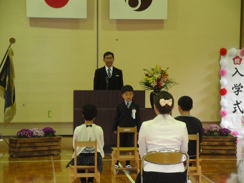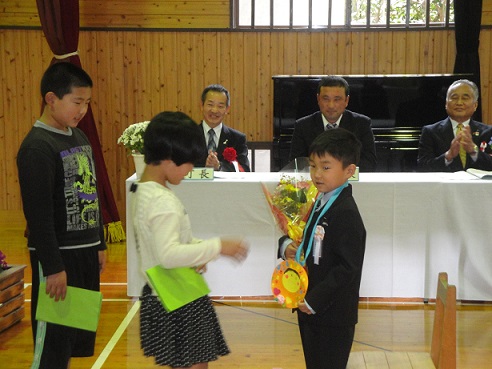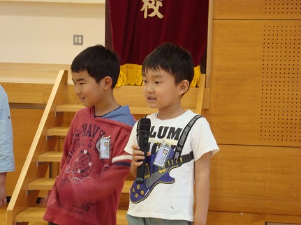 まずは本校体育館で一年生歓迎会をしました。一年生はみんなの前で「名前」と「好きなもの」を発表しました。分校の一年生もしっかりと発表できたと思います。