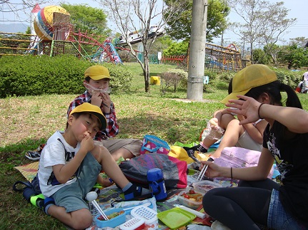 到着したら地区毎に集まって昼食(お弁当)をとりました。食べ終わったら公園の遊具でたくさん遊んで、帰りました。たくさん歩き、たくさん遊んで、疲れもあったと思いますが、子ども達は大満足の良い思い出になりました。