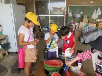 作業の後は、おおきなスイカをみんなで食べました。口いっぱいになりながら