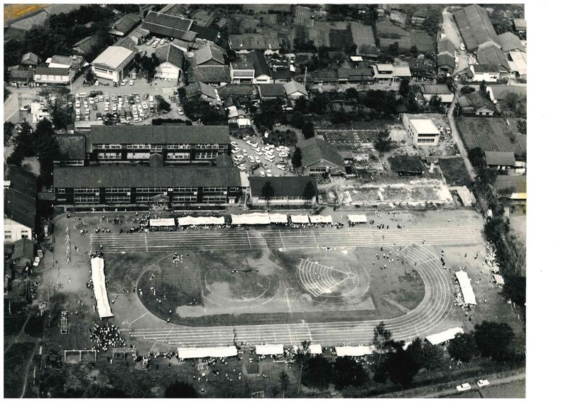 運動会の練習中でしょうか…テントが建っています。左(西)側には、プールはなく講堂が建っています。校舎も木造2階建てです…時代を感じます…