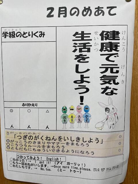今月は「健康で元気な生活をしよう」です。明日の黒っ子タイムでめあての中間反省をします。