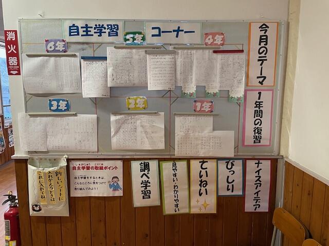 子どもたちが自ら学習する計画を立てる習慣づくりの一環として自学コーナーを設定しています。今月のテーマは「一年間の復習」です。得意分野を伸ばし、課題を解決したりとやり方はそれぞれです。自分の学びの実態に応じて学びを進めています。